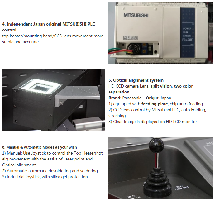 การออกแบบที่เป็นของแข็งช่วยให้การจัดวาง ชิป bga ที่แม่นยำเป็นพิเศษมี ขนาดไม่เกิน 2 มม. การจัดตำแหน่งจะดำเนินการโดยใช้ระบบวิชั่นวิชั่นแบบแยกส่วนช่วยให้สามารถดูวัสดุพิมพ์และชิป / ดายพร้อมกันได้ ภาพสองภาพซ้อนทับโดยใช้ไมโครมิเตอร์บนเวทีล็อคสูญญากาศที่มีความแม่นยำ ซอฟต์แวร์มีฐานข้อมูลของโปรไฟล์ที่กำหนดไว้ล่วงหน้าซึ่งผู้ใช้เลือกขึ้นอยู่กับตายและสาร ส่วนกำหนดค่าสามารถปรับเปลี่ยนได้อย่างง่ายดายปรับให้เหมาะสมและเก็บไว้สำหรับใช้ในอนาคต สามารถปรับการตั้งค่าได้ทันทีขณะที่กำลังทำงานโปรไฟล์ การควบคุมความร้อนด้วยซอฟท์แวร์ที่แม่พิมพ์ทำได้ผ่านการพาความร้อนของอากาศ